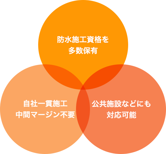 当社は、防水工事に関する資格を複数保有しているため、信頼性が高く、安心して工事を任せていただくことができます。また、自社一貫で施工のため中間マージンが不要です。